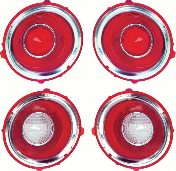 Save when ordering a complete set of tail lamp and back-up lamp lenses for your 1970-71 Camaro RS. This kit features lenses with chrome trim rings and includes 2 tail lamp lenses and 2 back-up lamp lenses with the early 1971 1st design circular optics.