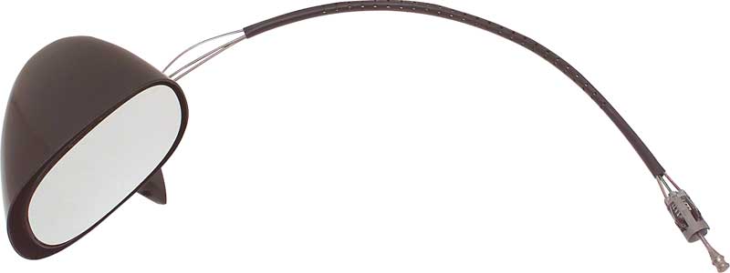 Reproduction of the original remote outer door mirror designed for use on various 1970-81 GM models including Camaro, Firebird, Nova, LeMans, GTO, Cutlass, 442, and others. Each mirror is manufactured from high-quality die-cast zinc and features a factory-style remote swivel design for accurate adjustment and functionality. Comes primered and ready for prep and paint to match the vehicle's exterior finish. Includes the pre-installed remote cable for easy installation and a factory-correct fit.