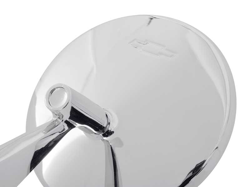 Reproduction of the original outer door mirror designed for use with various 1967-72 Chevrolet models. Each mirror is manufactured from durable die-cast zinc and finished to match factory specifications for a precise fit and authentic appearance. The mirror features the iconic Bow Tie emblem engraved on the rear housing, offering a true OEM-style detail. Includes mirror bracket, base-to-door gasket, and mounting screws for easy installation. Fits either RH or LH door. Sold individually.
