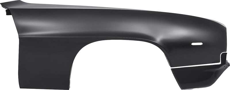 Reproduction of the original front fender designed for use on 1969 Camaro RS models (with concealed headlamp option). This fender is an excellent replacement for your rusted or damaged factory original. Manufactured in high grade stamped steel replicating the original GM fender in fit and appearance. Will install correctly and includes the front fender extension. Features a black electrophoretically deposited coating (EDP, or E-coat) for superior long-term corrosion protection. Fender is ready to be prepped, primed and painted without stripping.