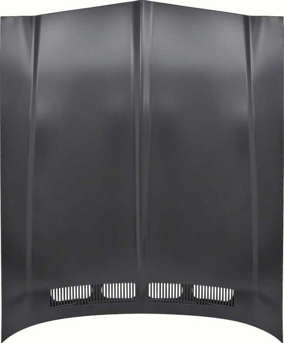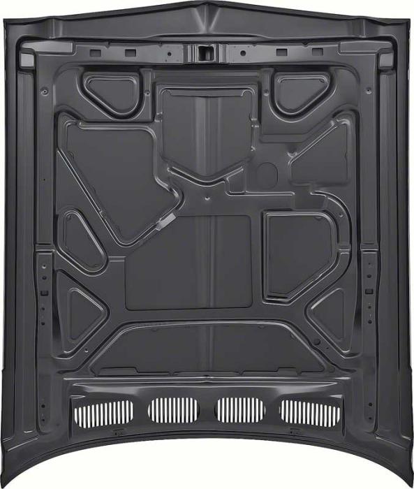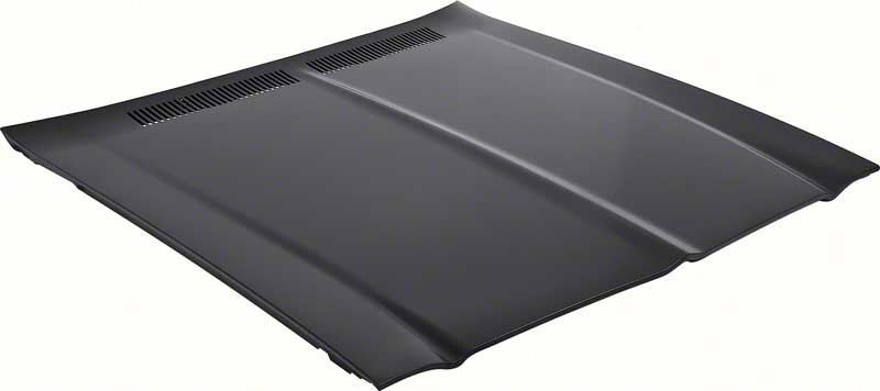 Each hood panel is manufactured from high-quality stamped steel to original factory specifications, featuring precise contours, factory-style underhood bracing, and correct cowl vent openings for an authentic appearance and fit. This reproduction hood bolts directly to existing hood hinges and uses factory hardware. Finished in black EDP coating to protect against rust and corrosion until ready for final prep and paint.