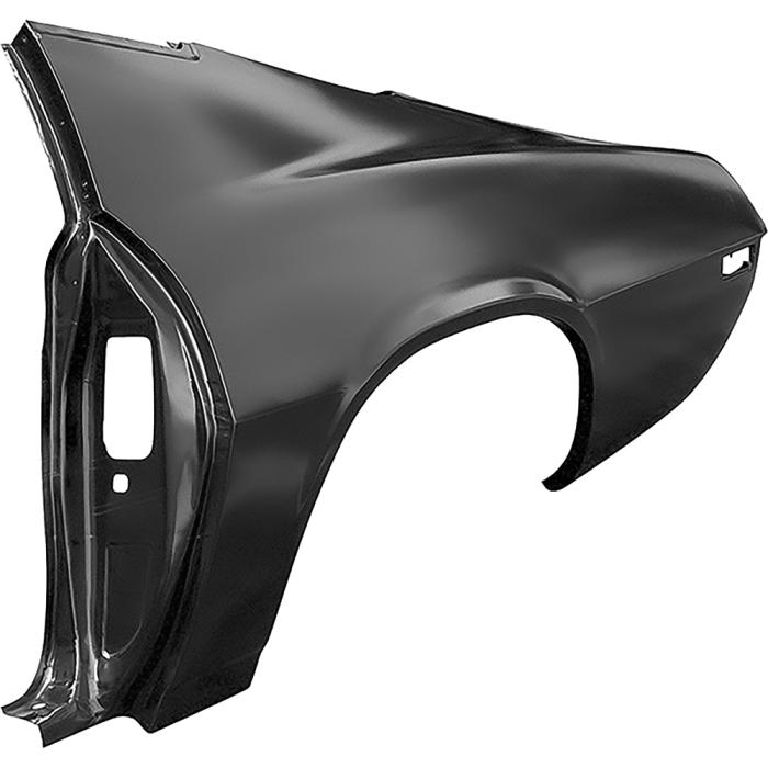 Reproduction complete quarter panel for 1970-73 Camaro models. Each panel is precision-stamped from heavy-gauge steel to exact factory specifications, providing an authentic appearance and superior fit. Unlike a basic outer skin, this full quarter panel replaces the entire section including the door jamb, trunk gutter, upper sail panel, and more. Designed to attach at the original factory seams for a clean and accurate restoration.