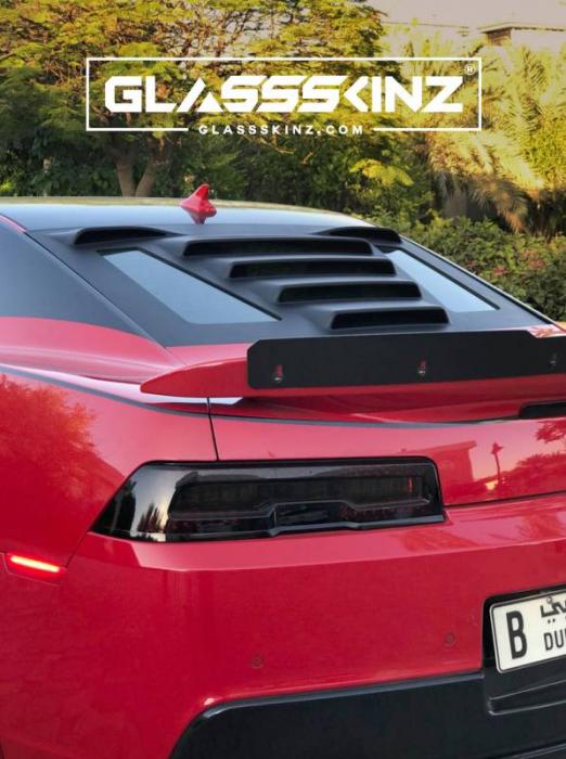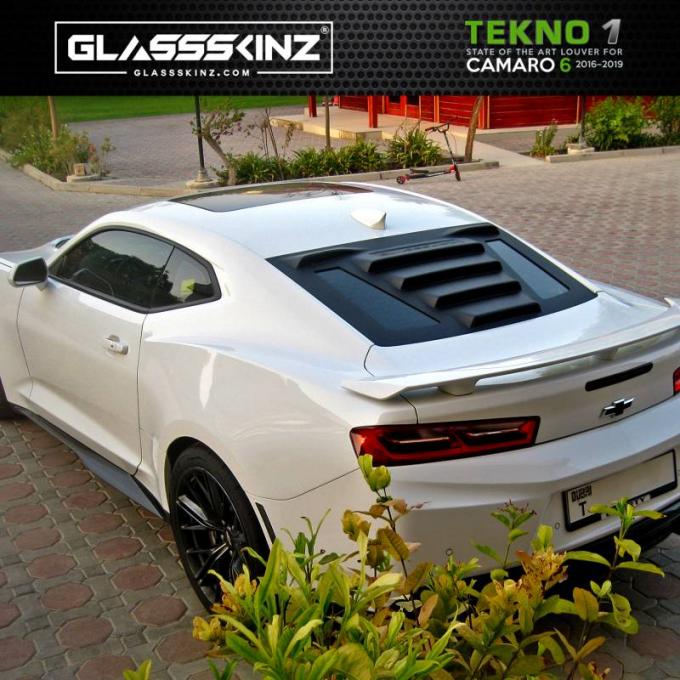 2016-19 Camaro GlassSkinz Tekno 1 rear window valance / louvers add dramatic styling, are easy to install, and are proudly made in the USA. Available in raw gloss black (NO painting or sealing required, ready to install), ALL OEM colors, satin black, & matte black