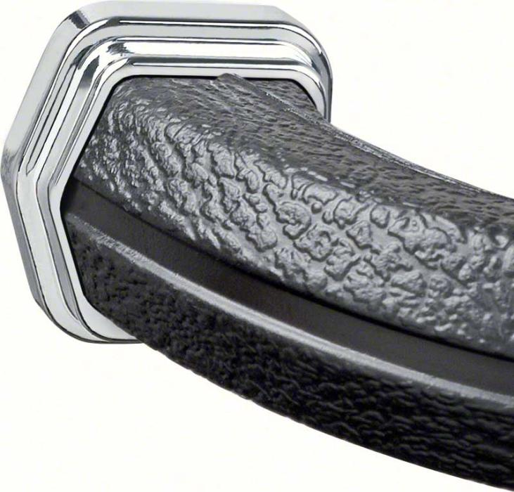 Reproduction of the original instrument panel assist handle chrome bezels designed for various 1967-69 Pontiac models. Manufactured in die-cast zinc featuring a bright chrome polished finish. These bezels attach to each end of the instrument panel assist handle and attaches to the dash above the glove box area. Sold in pairs. Includes RH and LH bezels. Pontiac Applications