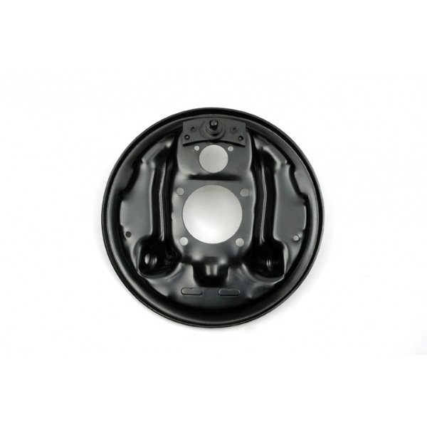 US made replacement rear end drum brake backing plate manufactured by the original OE supplier. Functional and very close in appearance to originals, but not technically correct. (There are two star wheel adjustment access plug knock-outs instead of one).