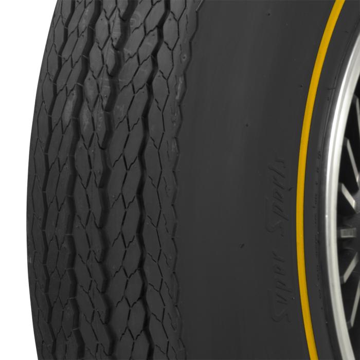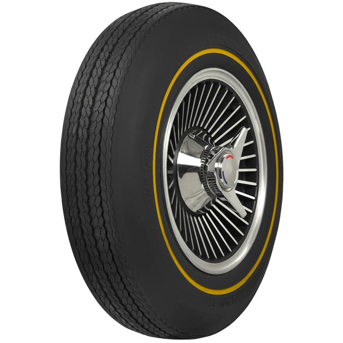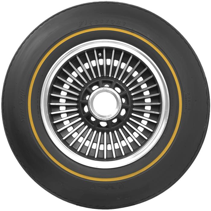 Corvette Sting Ray buyers could choose from many options, including the tires. Blackwall, narrow whitewall and goldline tires were options during the 1965 and 1966 Corvette Sting Ray production years. Goldline may also be referred to as goldwall or gold stripe tires. These tires are available in authentic Firestone, BFGoodrich and Goodyear brands in the original 775-15 bias ply size, and we also produce a modern radial BFGoodrich 205/75R15 with a 3/8-inch gold line.