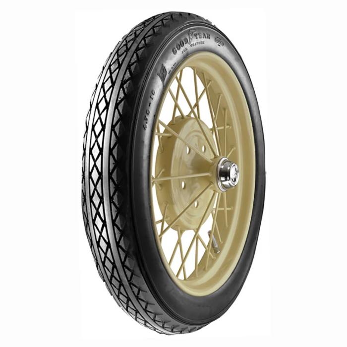 The Goodyear Deluxe All-Weather 475-19 bias ply tire is an excellent choice for a Ford Model A and features a black sidewall. The 475-19 size was used primarily on 1930 and 1931 Ford Model A passenger cars, and this blackwall version is one of the most authentic tires on the market. This tire features the famous diamond tread pattern and Goodyear sidewall markings. This iconic tire is perfect for a passenger car, and also works well on light trucks from the era. This Goodyear Deluxe tire is also an authentic choice for hot rods and customs. It features four-ply construction with polyester cords, and it is designed to be used with a tube.