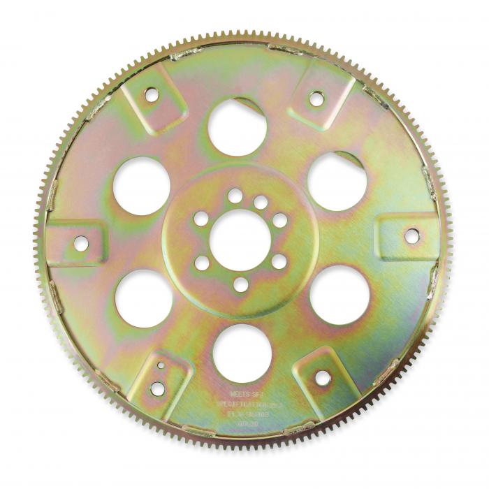 Constructed of thicker than stock steel plate to withstand the stress of high stall speed converters and high RPM enginge Securely welded ring gear with dual bolt pattern for use with either Powerglide or Turbo-Hydromatic transmission Meets SFI specification 29.1 for racing Hays heavy-duty flexplates for high performance and competition engines are constructed of a thicker than stock steel plate, enabling them to withstand the stress of high-stall torque converters and high-RPM engines. While factory stock plates tend to crack around the crankshaft hub when punished under high torque and RPM conditions, the thicker Hays flexplate handles the force. These H.D. flexplates are supplied with a ring gear that is securely welded in place and feature dual bolt patterns for use with either a Powerglide or Turbo-Hydromatic torque converter. All Hays heavy-duty flexplates are zinc-dichromate plated to resist corrosion and are SFI certified under specification 29.1.