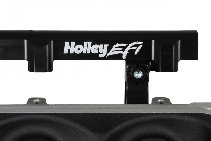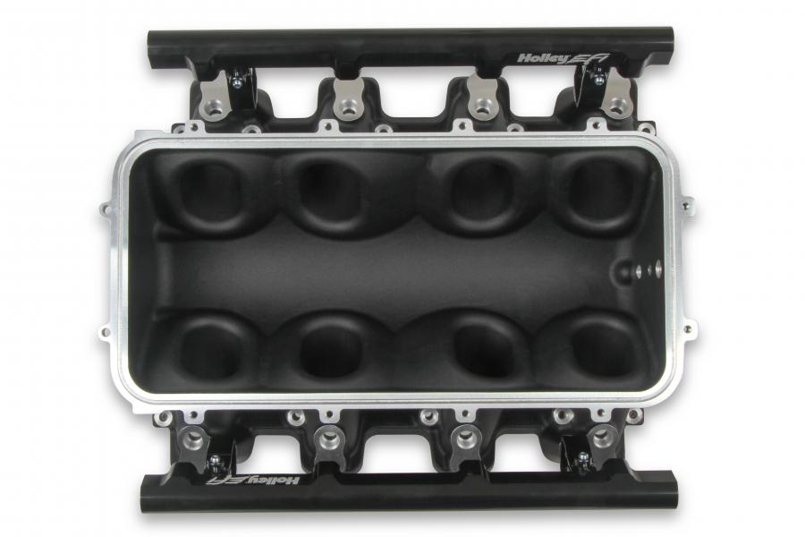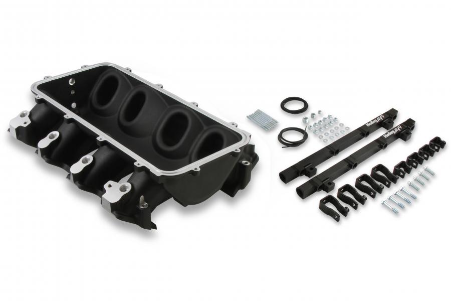 The Holley LS3 Lo-Ram intake manifold kits are designed for GM LS Gen III and IV engines equipped with GM LS3/L92 cylinder heads. These intake manifolds will work with OE or aftermarket cylinder heads. The Lo-Ram intake manifolds are designed for forced induction (supercharged or turbocharged) engine applications and the 105 mm throttle body part number 112-581 or similar models. The base intake manifold is designed with a low height to aid the packaging of a plenum-mounted air-to-water intercooler in a top-feed configuration. Additional manifold designs include both single and dual injector options. Available with both as-cast satin and black power-coat finishes. High volume fuel rails for eight and sixteen injector configurations. Mounting hardware included with 3/4-16 O-ring ports (8 AN)