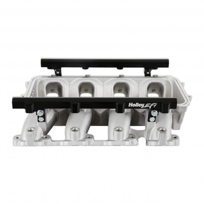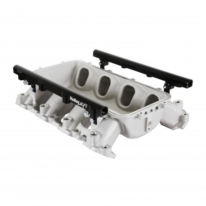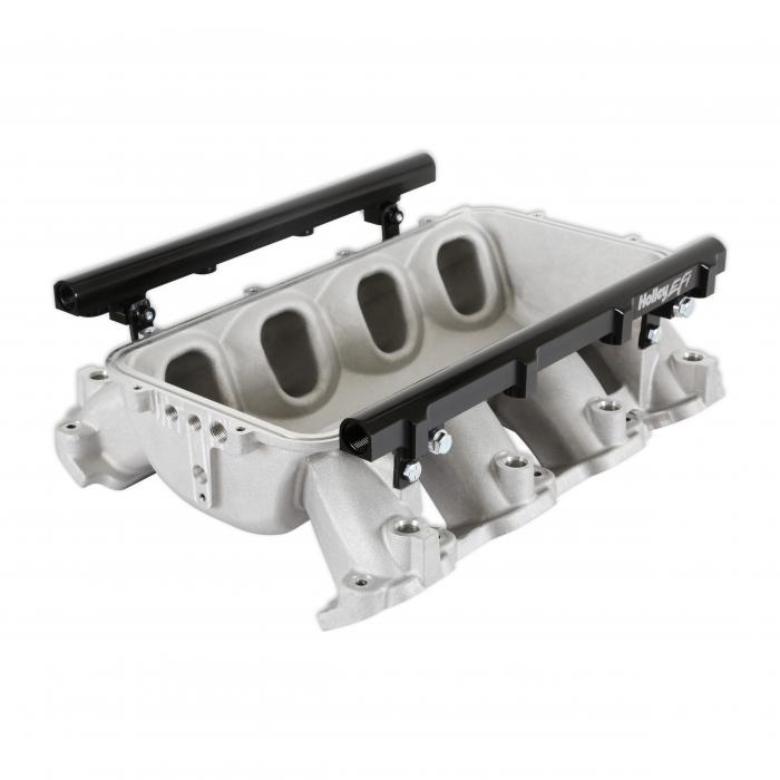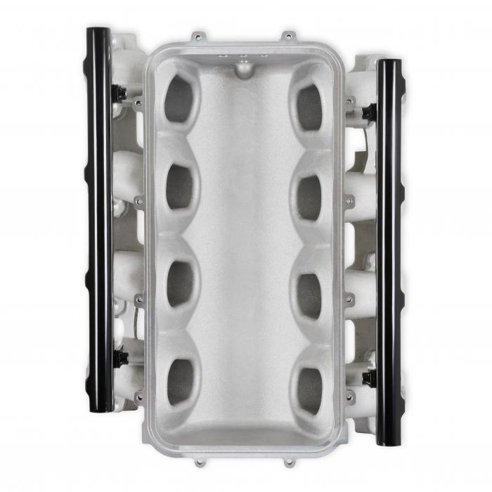 The Holley GM Gen V LT Lo-Ram intake manifold kits are designed for GM Gen V LT engines equipped with GM LT cylinder heads. These intake manifolds will work with OE or aftermarket cylinder heads. The Lo-Ram intake manifolds are designed for forced induction (supercharged or turbocharged) engine applications with peak power at 7,000-8,000 rpm depending on the application. The standard plenum top throttle body flange has a 105 mm opening to work with throttle body part number 112-581 or similar models. The top-feed plenum base intake manifold is designed with a reduced overall height to fit under a stock or mildly modified hood. The Lo-Ram provides a low profile modular intake manifold suitable for use with plenum mounted air-to-water intercoolers for boosted applications. Various Hi-Ram plenum top options are available to compliment the top-feed base intake manifold kits and fabrication flanges are offered to aid the fabrication of plenum tops for custom installations. Available for OE direct fuel injection only and with port fuel injection provisions. For the port fuel injection option, the high volume -8AN fuel rail kit includes hardware and brackets to accommodate long (usually standard length) fuel injectors or short (such as Pico, or LS7) fuel injectors.