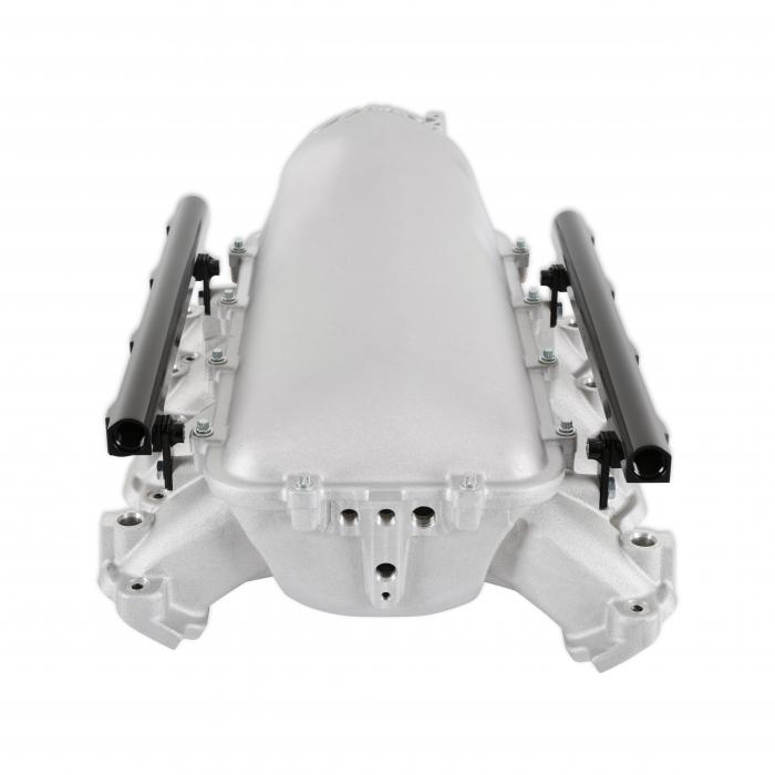 The standard plenum top throttle body flange has a 105 mm opening to work with throttle body part number 112-581 or similar models. The top-feed plenum base intake manifold is designed with a reduced overall height to fit under a stock or mildly modified hood. The Lo-Ram provides a low profile modular intake manifold suitable for use with plenum mounted air-to-water intercoolers for boosted applications. Various Hi-Ram plenum top options are available to compliment the top-feed base intake manifold kits and fabrication flanges are offered to aid the fabrication of plenum tops for custom installations. Available for OE direct fuel injection only and with port fuel injection provisions.