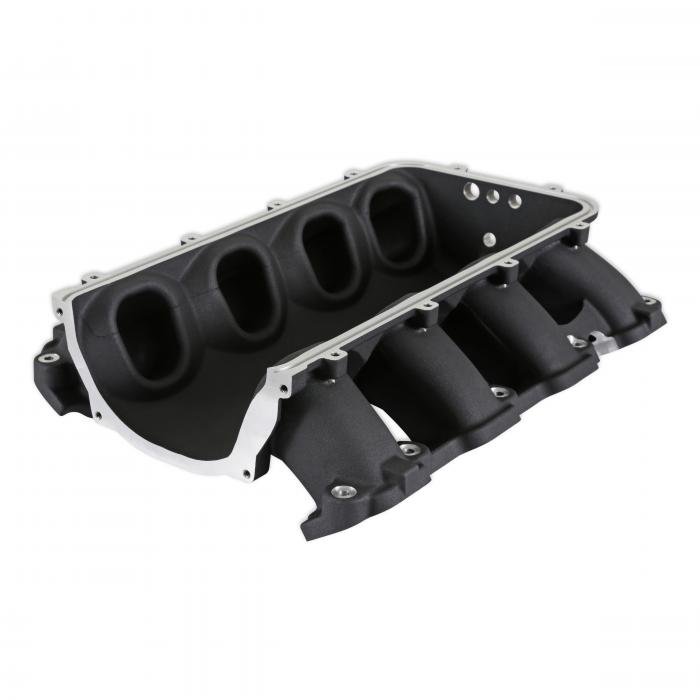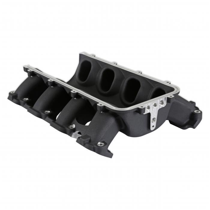 The Holley GM Gen V LT Ultra Lo-Ram intake manifold kits are designed for GM Gen V LT engines equipped with GM LT cylinder heads. These intake manifolds will work with OE or aftermarket cylinder heads. The Ultra Lo-Ram intake manifolds are designed for forced induction (supercharged or turbocharged) engine applications with peak power at 7,000-8,000 rpm depending on the application. The front entry throttle body flange has a 105mm opening to work with throttle body part number 112-581 or similar models. The front-feed base intake manifold is designed with a lower overall height to fit under a stock or mildly modified hood. The Ultra Lo-Ram provides a very low-profile modular intake manifold along with various fabrication flanges to aid the fabrication of special throttle body adapters or inlet ducts for custom installations. Available for OE direct fuel injection only and with port fuel injection provisions and a burst panel flange options. For the port fuel injection option, the high volume -8AN fuel rail kit includes hardware and brackets to accommodate long (usually standard length) fuel injectors or short (such as Pico, or LS7) fuel injectors.