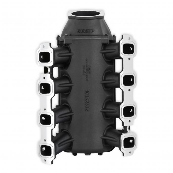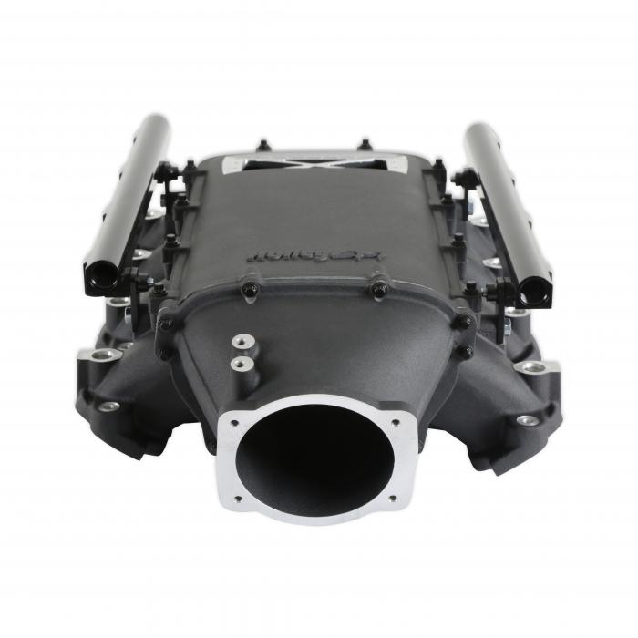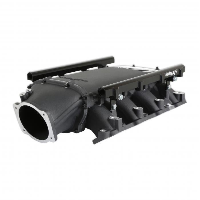 The Holley GM Gen V LT Ultra Lo-Ram intake manifold kits are designed for GM Gen V LT engines equipped with GM LT cylinder heads. These intake manifolds will work with OE or aftermarket cylinder heads. The Ultra Lo-Ram intake manifolds are designed for forced induction (supercharged or turbocharged) engine applications with peak power at 7,000-8,000 rpm depending on the application. The front entry throttle body flange has a 105mm opening to work with throttle body part number 112-581 or similar models. The front-feed base intake manifold is designed with a lower overall height to fit under a stock or mildly modified hood. The Ultra Lo-Ram provides a very low-profile modular intake manifold along with various fabrication flanges to aid the fabrication of special throttle body adapters or inlet ducts for custom installations. Available for OE direct fuel injection only and with port fuel injection provisions and a burst panel flange options. For the port fuel injection option, the high volume -8AN fuel rail kit includes hardware and brackets to accommodate long (usually standard length) fuel injectors or short (such as Pico, or LS7) fuel injectors.