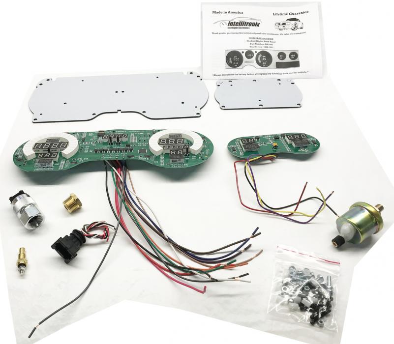Be the rage of the town in your 1970-1981 Pontiac Firebird with Intellitronix direct fit 70-81 Pontiac Firebird LED Digital Gauge Replacement Dash Panel. The 1970-1981 Pontiac Firebird LED Digital Panel comes complete with direct fit printed circuit boards, custom fit "smoked" plexiglass faceplate, universal temperature sending unit, oil pressure sending unit, and speedometer sending unit with senders and sensors for vehicles without electronic transmission or cruise control, and instructions for installation.