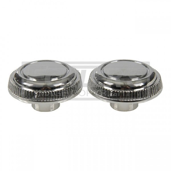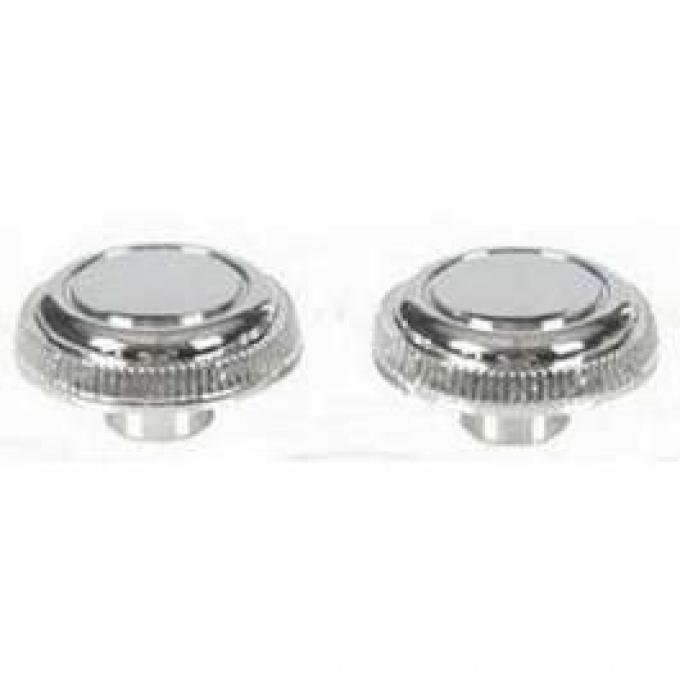 Hard chrome reproductions of factory original radio control knobs for original AM and AM/FM radios.