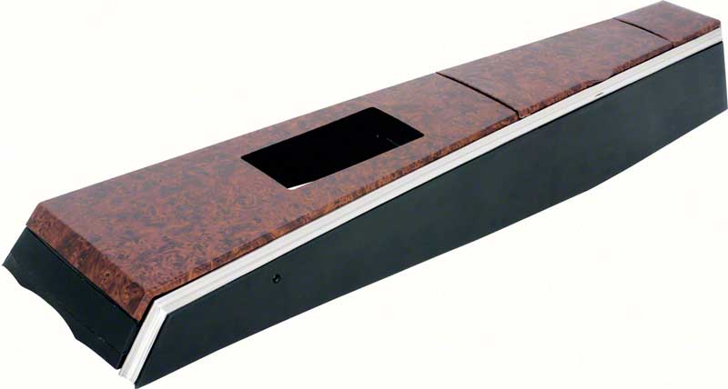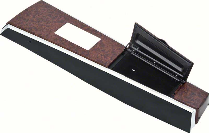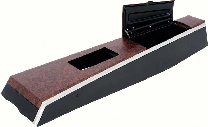 Injection molded and die-cast reproduction of the original 1968-69 Firebird console assembly. Manufactured to exact specifications including correct Burlwood design. The Firebird console assembly includes a separate wood grain metal trim overlay as originally offered. The overlay is attached to the console offering an original appearance. The console box has the correct soft flocked lining. This complete assembly includes the chrome trim and console door as shown. Console shift plate sold separately.