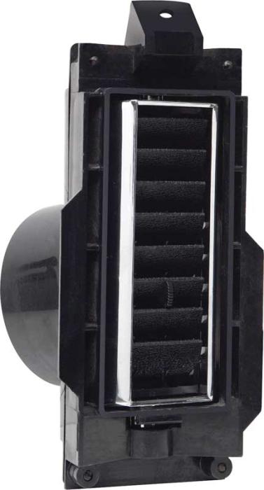 Reproduction dash side vent for 1969 Camaro models without AC. Each dash side vent features a chrome plated plastic air vent with correctly textured black plastic fins. Vent housings are manufactured in injection-molded ABS plastic as original and feature foam bushings on vent roller surfaces for smooth operation and correctly positioned mounting holes. For use on RH (passenger side).