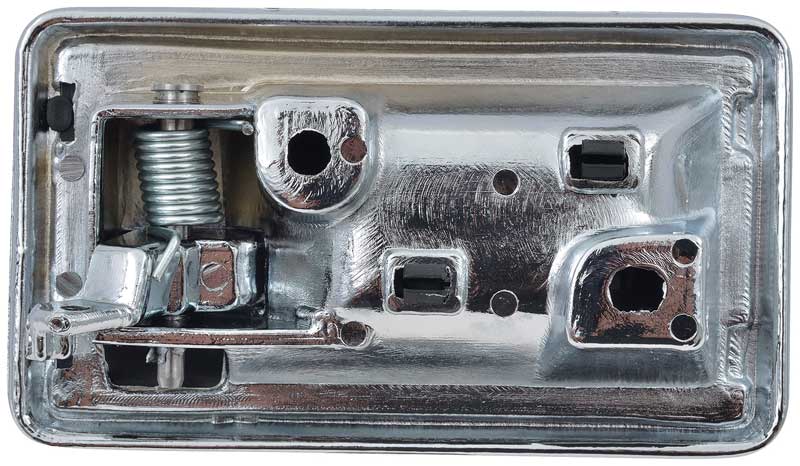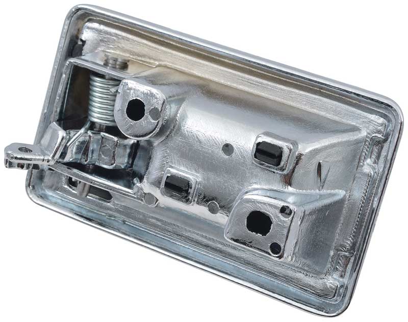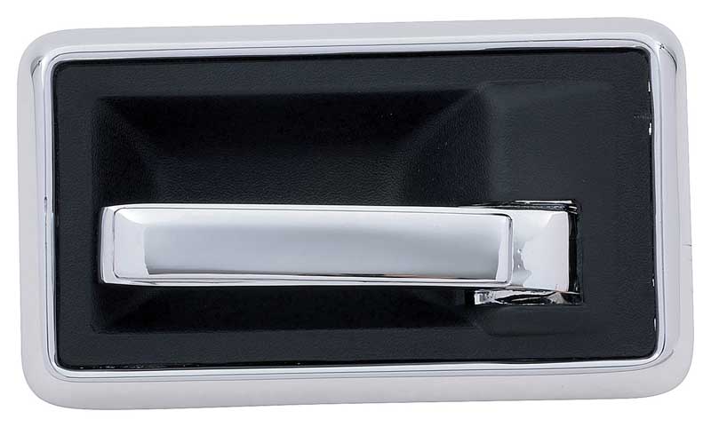 Correct reproduction of the original inner door handle assembly designed for use on various 1970-74 GM models. Each inner door handle is manufactured in zinc die-cast metal featuring correct chrome outer trim, black inner bezel and chrome handle. Will replace the original handle exactly.