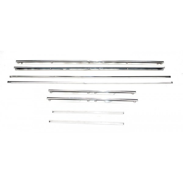 Best Quality Reproduction Highly Polished Stainless Steel Correct Profile For Standard Interior Coupes 8-piece Set Best reproduction available of the interior molding kit for the 1967 Camaro. This kit includes the pieces that bolt to the upper metal on the door and rear side which the upholstery panels slide under and the lower moldings for both.