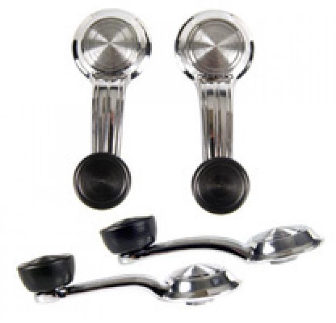 Not a generic aftermarket or later design product. Correct curve and shape reproductions (including casting numbers) of the originals for applications listed. Correct knob, knob attachment and spline depth. Quality chrome die cast. Black knob. Handle clips included.