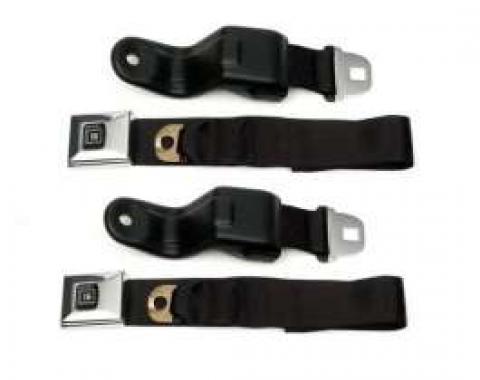 Best Quality Original Style Seat Belts For Camaro Black Plastic Standard Buckles GM Mark Of Excellence Logo Button In Blue Working Retractors With Blow Formed Protectors Installed Does 2 Front Bucket Seats Taking chances with 40+ year old…