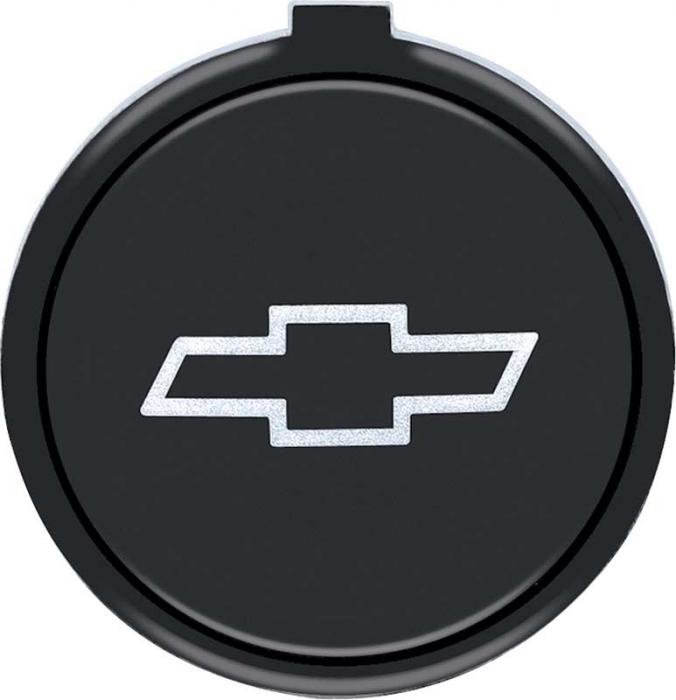 Reproduction Bowtie horn cap emblem for 1971-81 Camaro and 1971-79 Nova models equipped with the optional NK4 4-spoke sport steering wheel. The emblem features a black background with a white Bow Tie insignia. Refer to part number # 329738 for horn button cap. This emblem was also installed on door panels for Camaros equipped with power windows. Inserts into the door panel bezel. Refer to part number # 3879552 for bezel.
