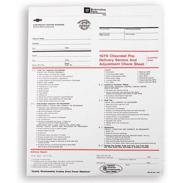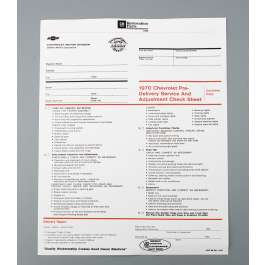 Reproduction Of Original This Camaro reproduction pre-delivery sheet has been manufactured to original factory specifications using today's modern manufacturing techniques. You will find the quality & appearance will work superbly for your restoration.
