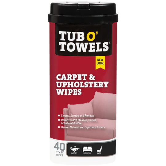 Tub O’ Towels carpet and upholstery cleaning wipes remove your toughest stains. Specifically designed for carpet and upholstery cleaning, these wipes are gentle yet tough on stains. Clean wine spills, remove pet stains from upholstery, and remove coffee from leather!