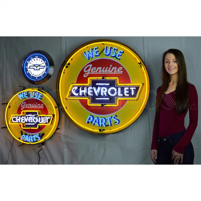Neonetics neon signs in metal cans feature multi-colored, hand blown neon tubing. Each sign has a full color backround, which makes this sign beautiful to look at whether it is turned on or off. The Chevrolet sign measures 3 feet across, weighs 80 lbs., and the yellow, white and blue neon tubes are surrounded by a sturdy, commercial grade black steel housing. Your neon sign will come to your door suspended in a wood crate made especially to transport this giant neon sign. Unpacking instructions are included. All you do is hang it up and plug it in – no assembly or special wiring required. Also pictured is our standard 24 inch Chevrolet neon sign, and our Chevrolet neon clock, which are sold separately. Neonetics neon signs have a warm mesmerizing glow, and are powered by industrial strength transformers, which operate silently and more efficiently than incandescent bulbs. For the collector who want the best and biggest neon money can buy!