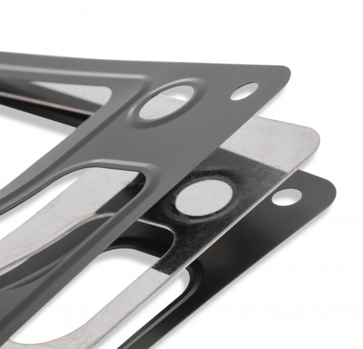 Our unique Multi-Layered steel head gasket embossment formation process optimizes the embossment radius, reduces stress points, enhances gasket conformability, and provides uniform clamp load distribution. This all results in superior surface contact between block and cylinder head. All head gasket layers/spacers go through an additional process to significantly reduce forming induced stress. Advantages are reduced brittleness in material, increased flexibility and deformation retention. This stabilizes the gasket, resulting in reduced cylinder bore distortion and improved combustion seal fro the extreme cylinder pressures found in high compression, supercharged and turbocharged applications. A proprietary polymer coating ensures the micro-seal of engine coolant and oil fluids.