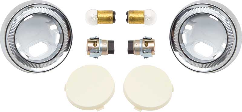 OER reproduction of the original style dome lamp lens bezel and lens kit for various 1959-68 GM vehicles including 1962-66 Impals 2-door hardtop and 1967 Camaro/Firebird with custom/deluxe interior. This kit features 2 round dome lens bezels, 2 round dome lenses, 2 dome lamp sockets and 2 bulbs. Fits on the rear side quarter sail panel area on many applications, or on the door, or console on various models. Sold in convenient sets, ready to install!