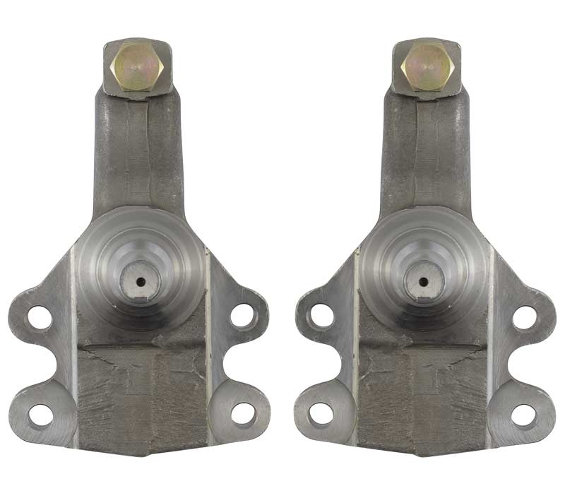 Reproduction of the original style 2" drop spindles for various 1964-72 Buick, Chevrolet, Pontiac, and Oldsmobile A, F, and X body models. These 2" drop spindles will replace OE single piston disc brake spindles. The stock steering arms bolt to the same location as on the stock spindle, maintaining the steering geometry. Refer to part number #153644 for disc brake backing plates, sold separately.