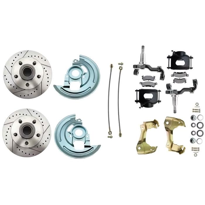 Front disc brake conversion kit for 1964-74 GM A, F, X-Body models. Each kit comes with stock height spindles, vented drilled and slotted 11" rotors, and black powder coated pre-loaded brake calipers. This kit is designed to be used with 15" or larger wheels.
