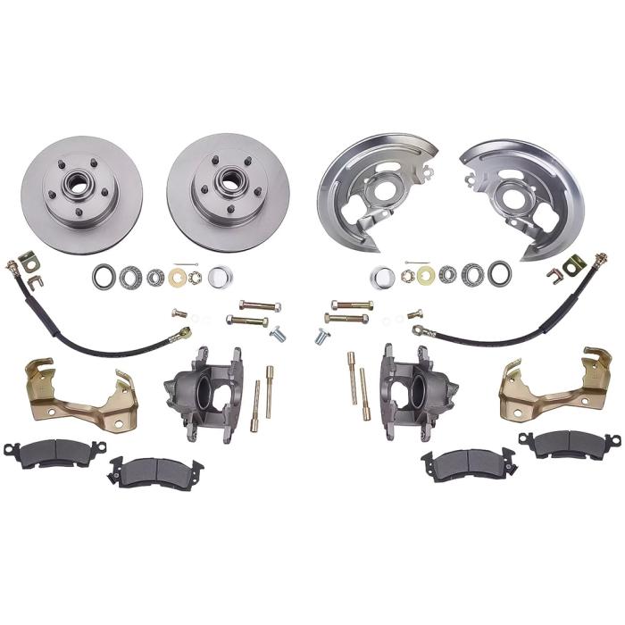 Front disc brake conversion kit for 1964-74 GM A, F, X-Body models allows you to upgrade to 11" rotors and 1969-77 GM midsize calipers on your stock 1964-74 disc brake spindles or our K6151, or 154893 disc brake spindles. Each kit is designed to be installed using stock style disc brake spindles (sold separately), and includes vented plain 11" rotors, and natural finish brake calipers. This kit is designed to be used with 15" or larger disc brake compatible wheels. Not compatible with drum brake spindles.