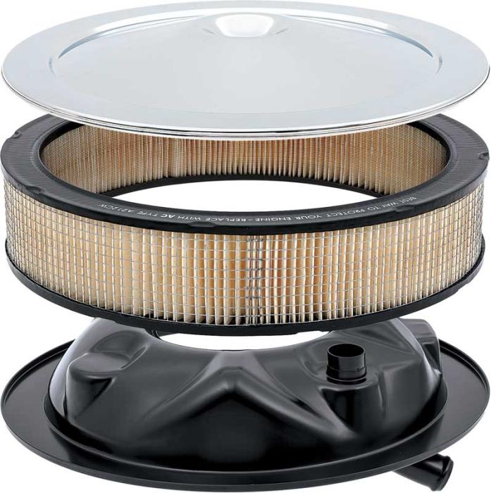 OER® reproduction open element air cleaner assembly as originally installed on a variety of 1966-69 high performance Chevrolet engines. Each air cleaner assembly includes the base, filter element and a highly-polished chrome lid.