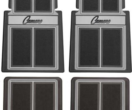 Protect your interior carpet and give your Chevrolet Camaro a unique look by adding these custom style floor mats for front and rear. Floor mats are designed for use with all 1967-1969 Chevrolet Camaro models. Each mat features the "Camaro" logo in the correct early style factory script lettering. These custom mats are manufactured in high-grade automotive Plastisol material that offers years of long-lasting durability. Includes front and rear floor mats (4 piece set).