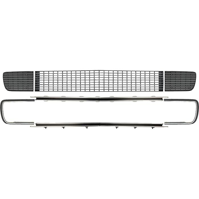 This Restorer's Choice™ grill kit includes a Rally Sport grill, headlamp door covers, and the upper and lower grill and headlamp door moldings. The upper molding includes the header panel to molding attachment clips. The moldings were originally riveted to the center grill but replacements install with nuts and bolts (not included) making installation somewhat easier. Mounting hardware not included.