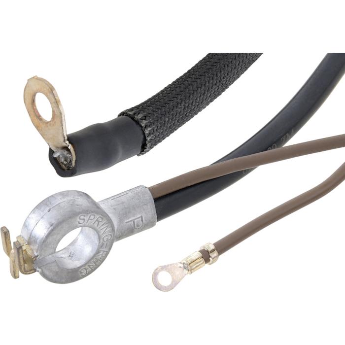 Reproduction spring ring positive battery cable designed for 1967-68 Camaro with 396, 1969 with 396, 427, and 1968 Nova with 396 engine. Each cable is reproduced exactly as the original using the same OEM-type spring terminals and connectors. The terminal end includes the word "Spring Ring" in the correct size, style and font. Each cable is produced to factory specifications for complete authenticity and includes the original wire markings. Length 52" Secondary 24.50". Sold individually.