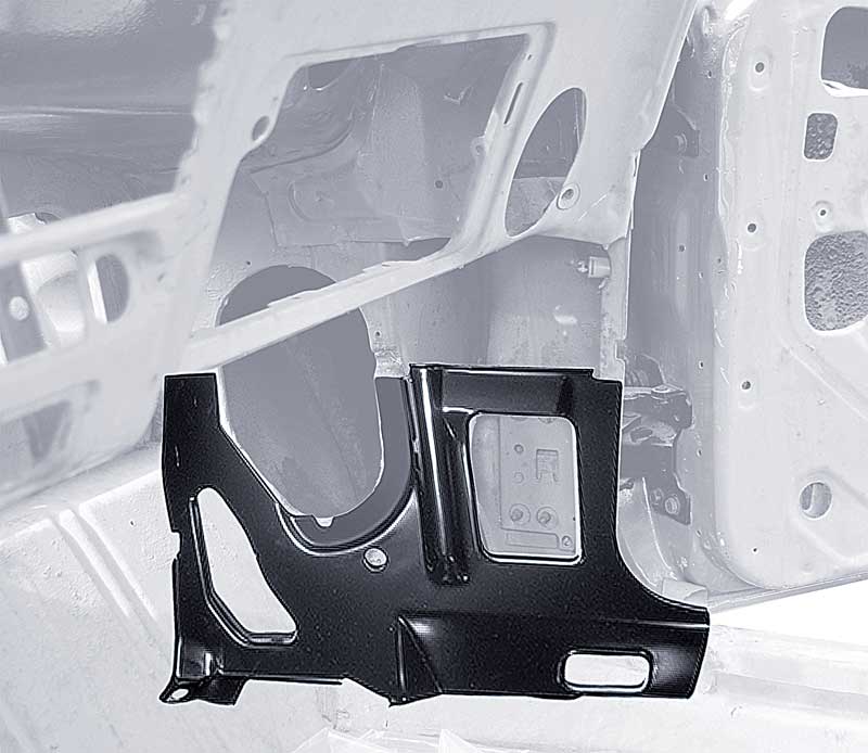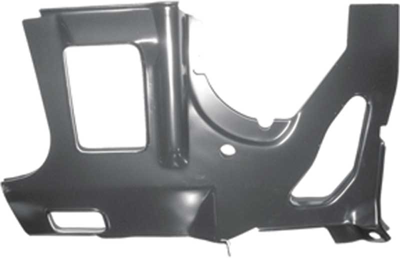 Reproduction of the original lower hinge pillar to rocker panel reinforcement section for use with 1967-69 Camaro, Firebird, and 1968-79 Chevy II, Nova and GM X-body models. Each panel is manufactured in stamped steel to correct factory dimensions allowing replacement of the damaged or rusted original panel. This panel is commonly rusted at the bottom section. Mounts between the inner rocker panel and the front wheel and is covered by the kick panel.