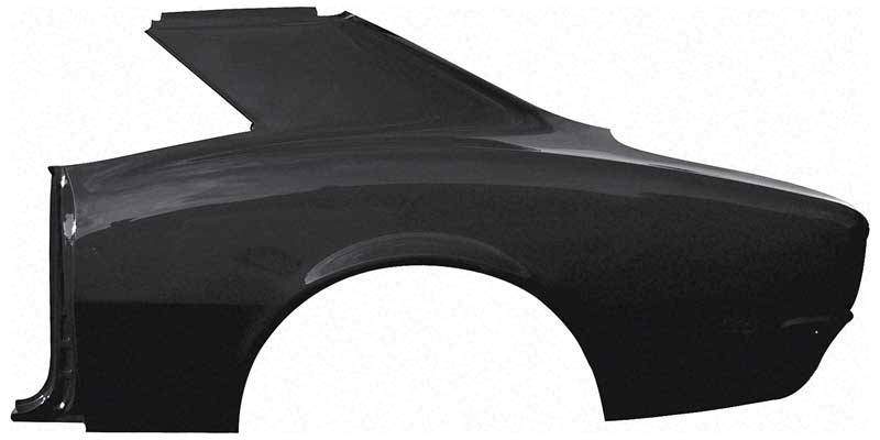 Reproduction complete quarter panel for 1967 Camaro coupe models. Each panel is precision-manufactured in quality stamped steel to match the original factory specifications in design, detail, and fitment. Unlike a simple quarter skin, this panel replaces the entire section including the door jamb, trunk gutter, upper sail panel, and more. Designed to attach at the original factory seams for a seamless, factory-style installation.