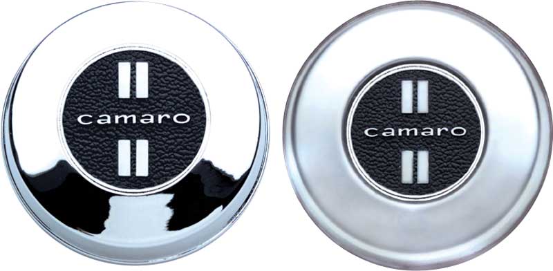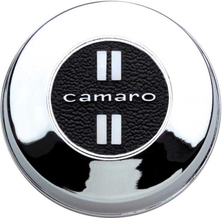 Reproduction of the original horn cap designed for use on 1967 Camaro deluxe interior models. Each horn cap is manufactured in original style polished chrome zinc die-cast metal. This part includes the Camaro lettering correctly cast into the horn cap. Will mount to steering wheel same as original cap.