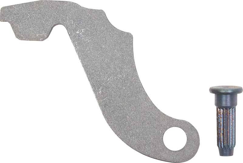 Reproduction of the original lower door hinge arm and rivet for use with 1967 Camaro and Firebird models. Often damages or broken, this is the arm on the lower door hinge with the notches cut out that the detent roller rides in. Also the door hinge tension spring latches into this arm. Sold individually.