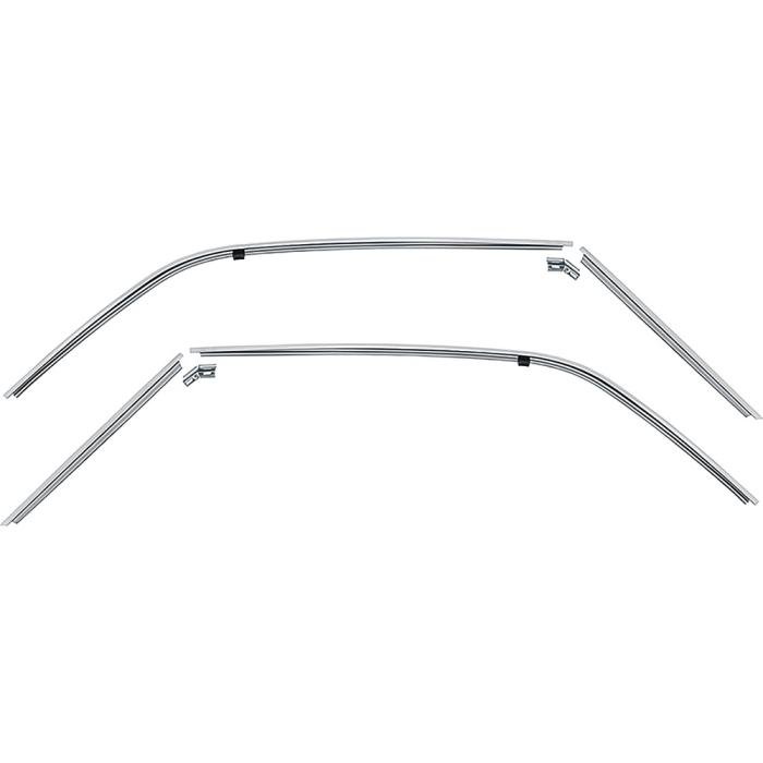 Reproduction roof rail weatherstrip retainer set for 1967 Camaro and Firebird coupe models. This set features the retainers used on the front pillar as well as the upper/ rear retainer that runs along the roof line and down above the quarter window. This 6 piece set also includes the corner pieces that join the two channels together above the front pillar.