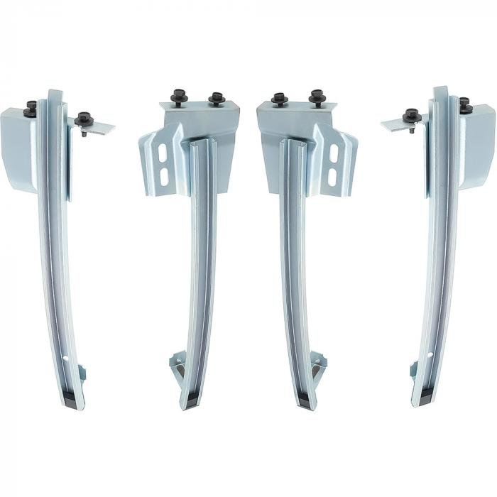 Reproduction vertical door window track set for both doors on 1968-69 Camaro and Firebird models. Each 4-piece track set is manufactured to factory specifications featuring original style plating and correct adjustable mounting brackets. This is the track that guides the door glass up and down within the door shell on both sides of the vehicle. Replaces GM part number #'s 7734316, 7734317 front tracks and 7734318, 7734319 rear tracks. Each kit is designed to replace the fropnt and rear tracks in both the RH and LH doors.