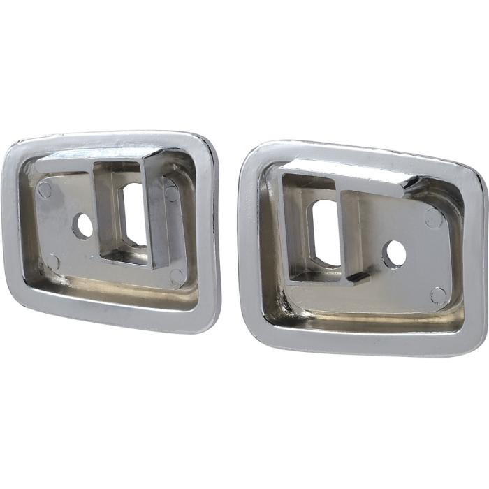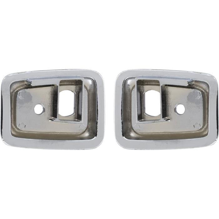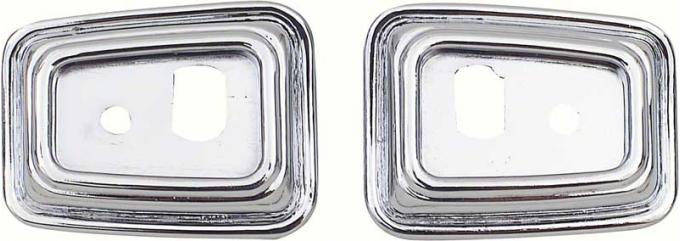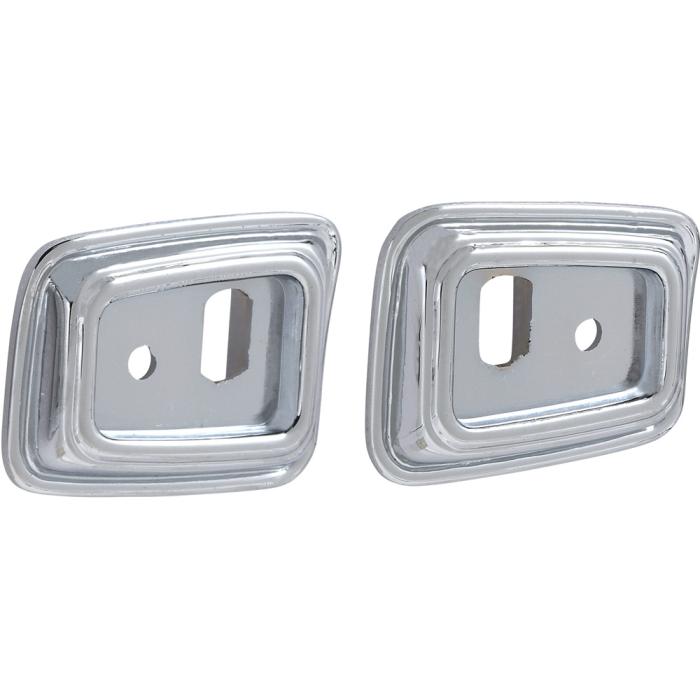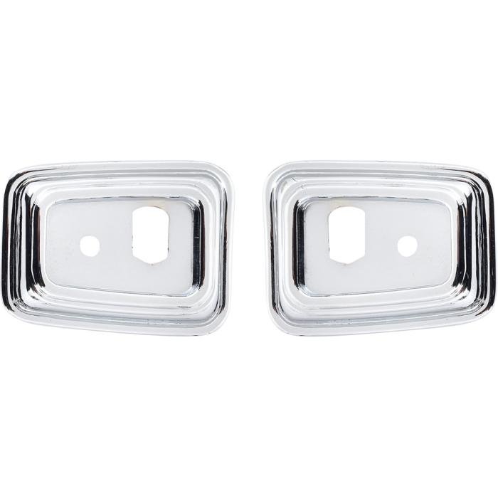 Reproduction of the original inner door panel bezels used to mount the door grab handles on 1968-69 Camaro models with deluxe interior molded door panels. Manufactured in quality die-cast zinc to factory specifications. Each bezel features a bright polished chrome finish replicating the original in every detail. Sold in pairs. 2 pair required per vehicle.