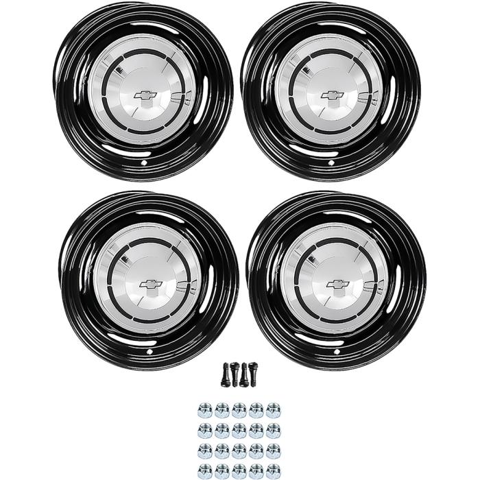 Reproduction factory steel wheels and 1968-69 style Chevrolet dog dish hub caps. These wheels can be used on most 1958-96 Chevy applications when a dog-dish style cap is desired, or on various 1955-87 GM models with 5 x 4-3/4"" bolt pattern.