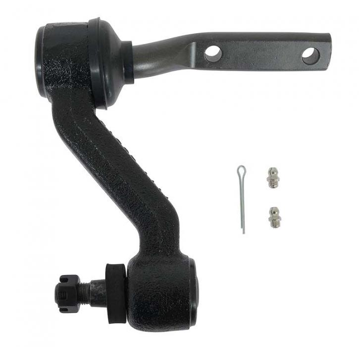 Reproduction of the original idler arm assembly designed for use with various 1968-74 Camaro, Firebird, Nova, and GM X body models. This pivoting support for the steering linkage appears on older recirculating ball-type steering systems (pre-rack & pinion) and functions like the pitman arm in a rack and pinion system. This black, cast-iron steering arm features two holes for mounting to the frame, a rubber boot on the mounting section of the idler arm and also includes two fittings and a hex-nut with slots in it to retain a cotter pin.