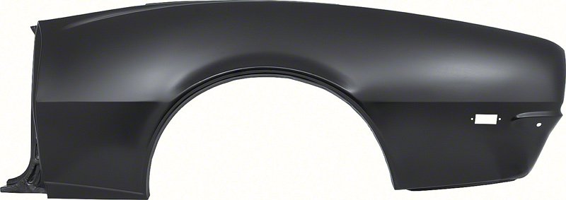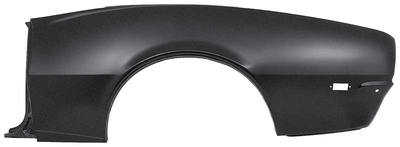 Reproduction complete quarter panel for 1968 Camaro convertible models. Each panel is manufactured from high-quality stamped steel to exact factory specifications, providing an authentic fit and finish. Unlike a simple quarter skin, this full panel replaces the entire quarter section including the door jamb, trunk gutter area, and the pre-cut side marker lamp opening. It also features a reinforced bumper bracket area identical to the original for added strength.
