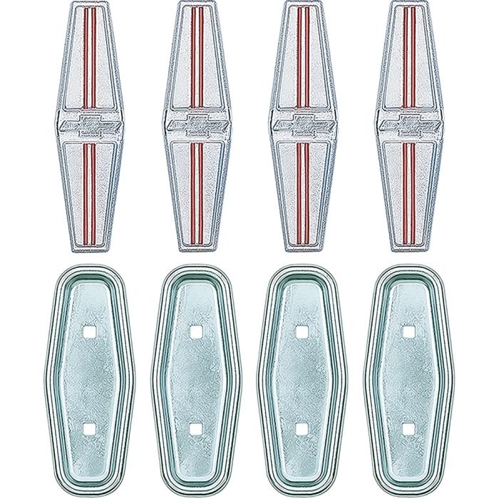 Reproduction seat back trim emblem set set with backing plates for 1968 Camaro models with deluxe interior. Each emblem set features the diamond shaped die-cast emblems with Bow Tie logo and twin red racing stripes. Emblem buttons are manufactured in die cast zinc, chrome plated, and painted to factory colors. Set includes 4 diamond-shaped Bow Tie emblem buttons and 4 stamped steel backing plates to fit the front buckets and rear seats.