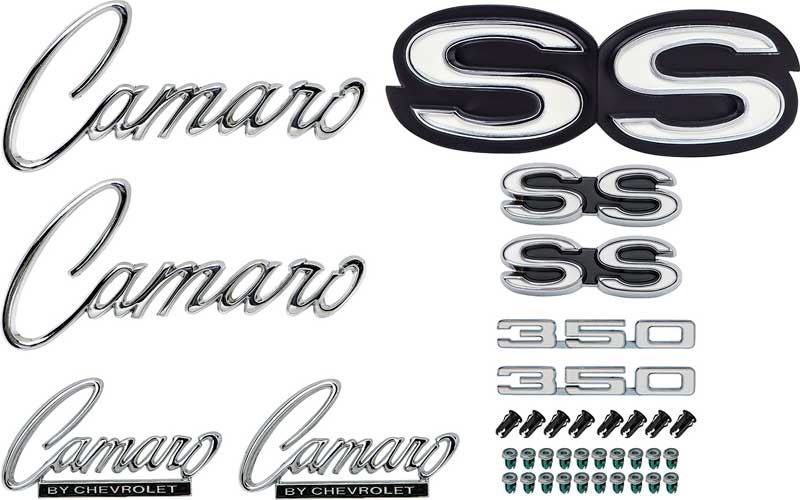 Complete exterior emblem kit designed to replace the fender, grill, rear panel, header panel, and trunk lid emblems for 1968 Camaro Super Sport models with the RS hidden headlamp option. Each emblem is manufactured to replicate the original in quality, appearance, and fitment. Emblems are manufactured in die-cast zinc material and include proper polishing and paint when required. Each kit includes the correct body emblems with proper engine size and lettering. Kit includes correct brackets and barrel nuts for installation when required.
